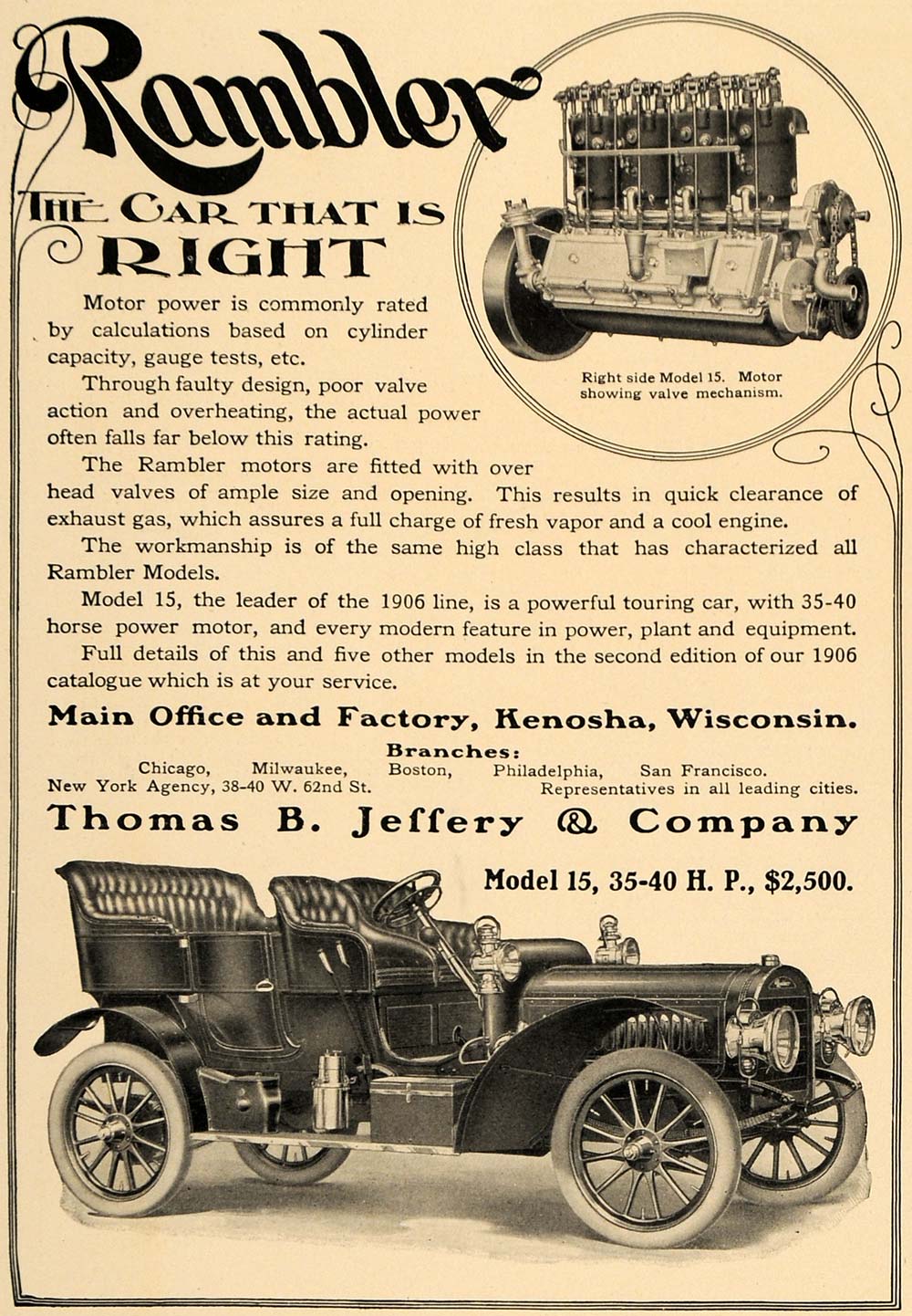 This is an original 1906 black and white print ad for the Rambler automobile Model 15 motor by Thomas B. Jeffery and Company located in Kenosha, Wisconsin.