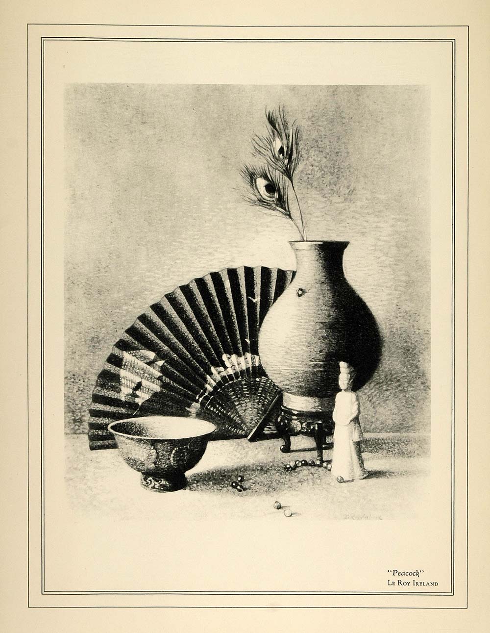 "Peacock." This is an original halftone print of a painting by American artist, Le Roy Ireland, displayed in the Paramount Theatre. c1930. Ireland was one of the top still life painters.