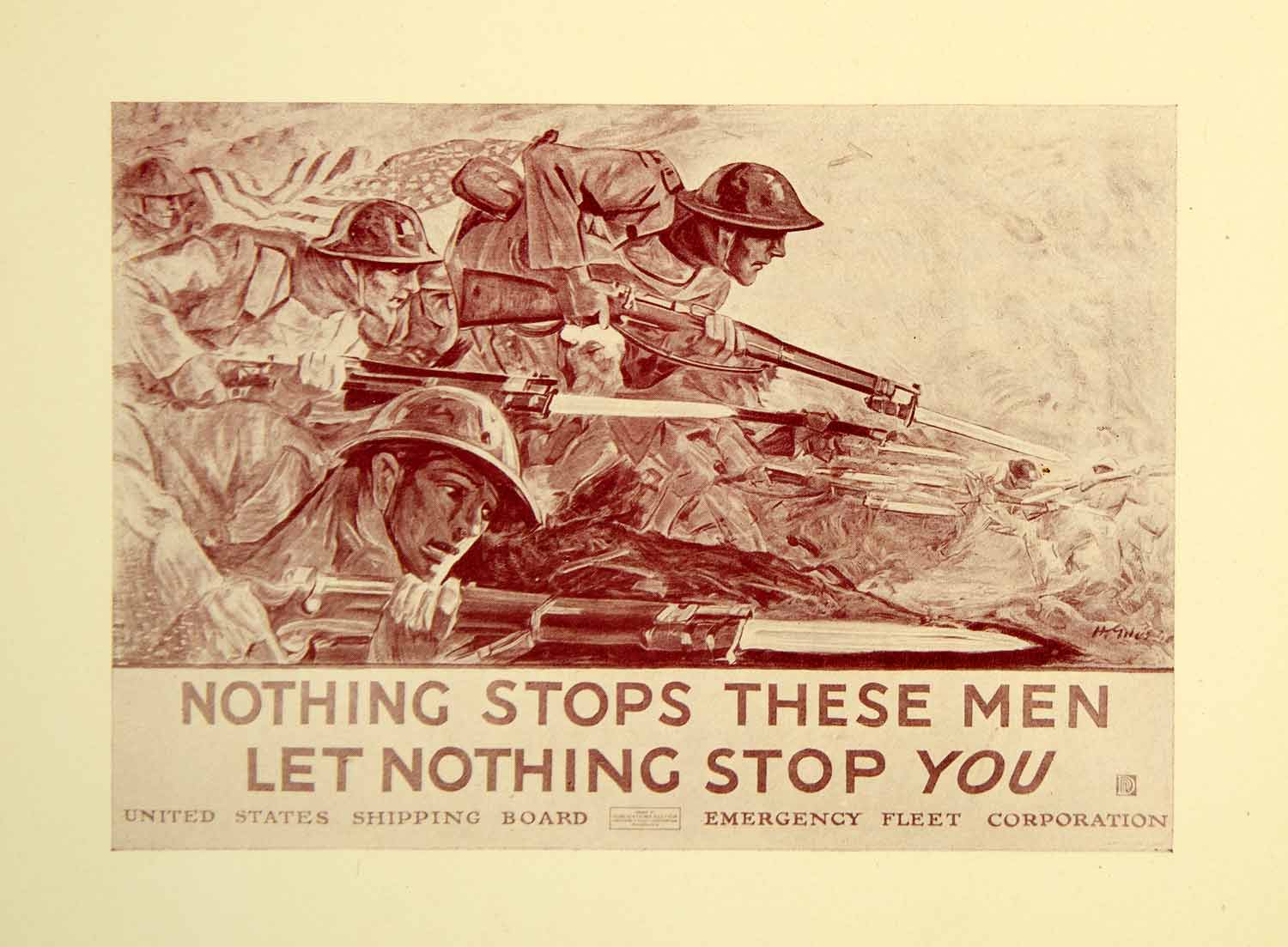 This is an original circa 1920 sepia relief halftone print that reads "NOTHING STOPS THESE MEN, LET NOTHING STOP