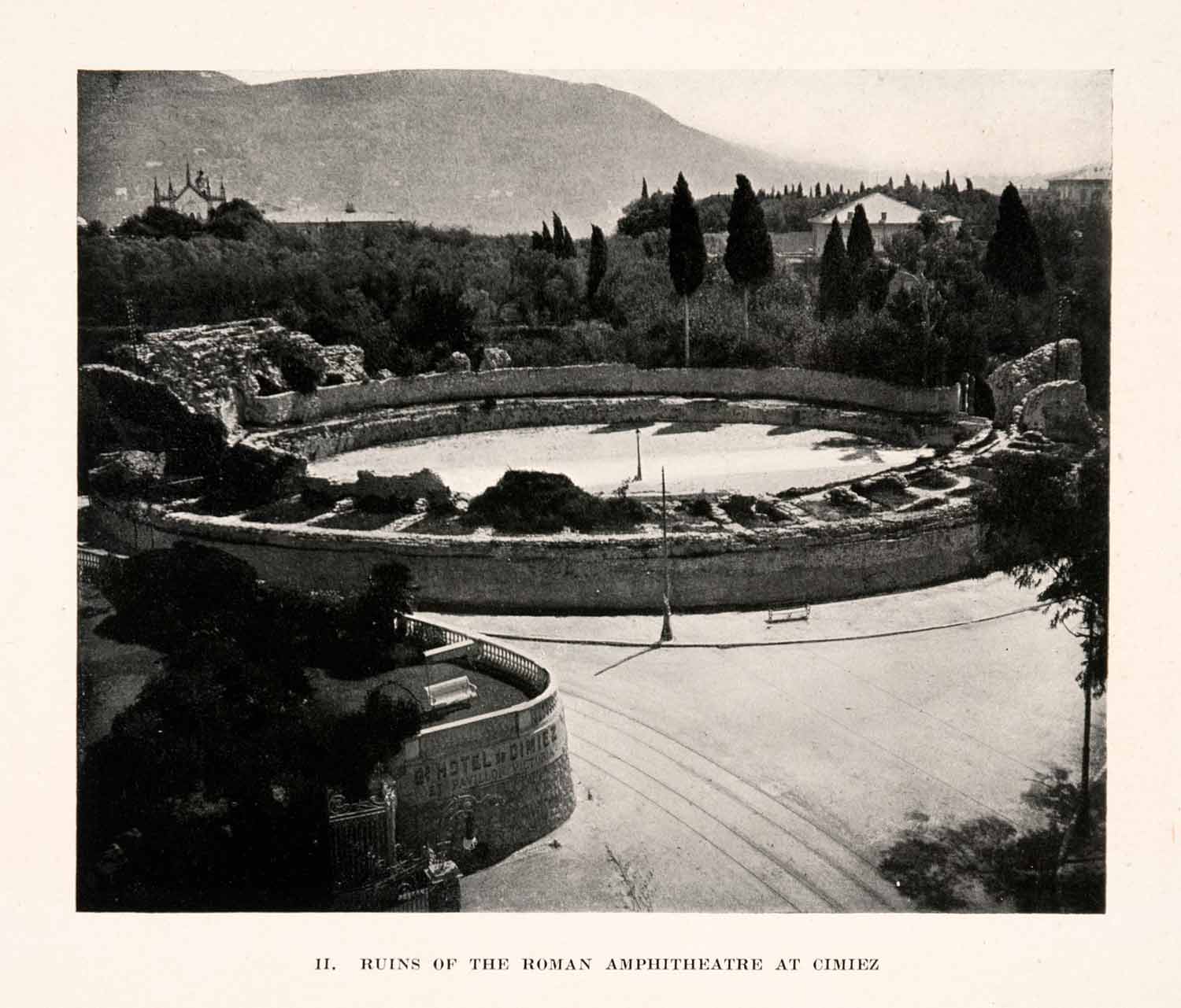 This is an original halftone print of the ruins of a Roman amphitheater at Cimiez in Nice, France. In the foreground is the Hotel de Cimiez and the Victoria Pavilion.